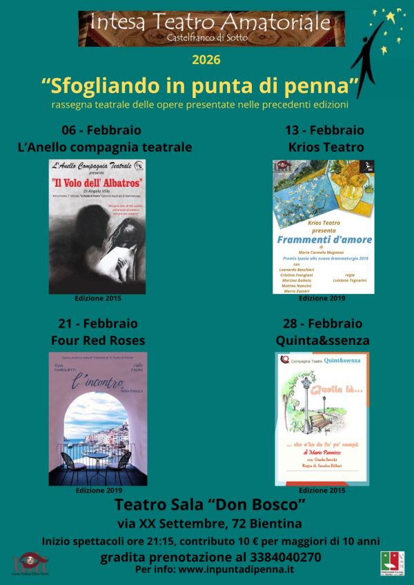 I testi finalisti della 10^ edizione dl Concorso di drammaturgia teatrale “In punta di penna” sono stati assegnati ad altrettante compagnie di Teatro Amatoriale. Questi gli abbinamenti :